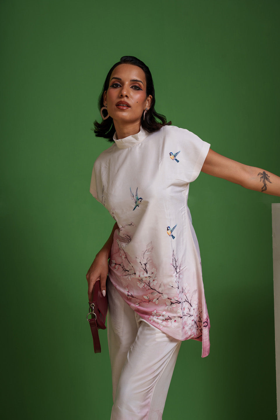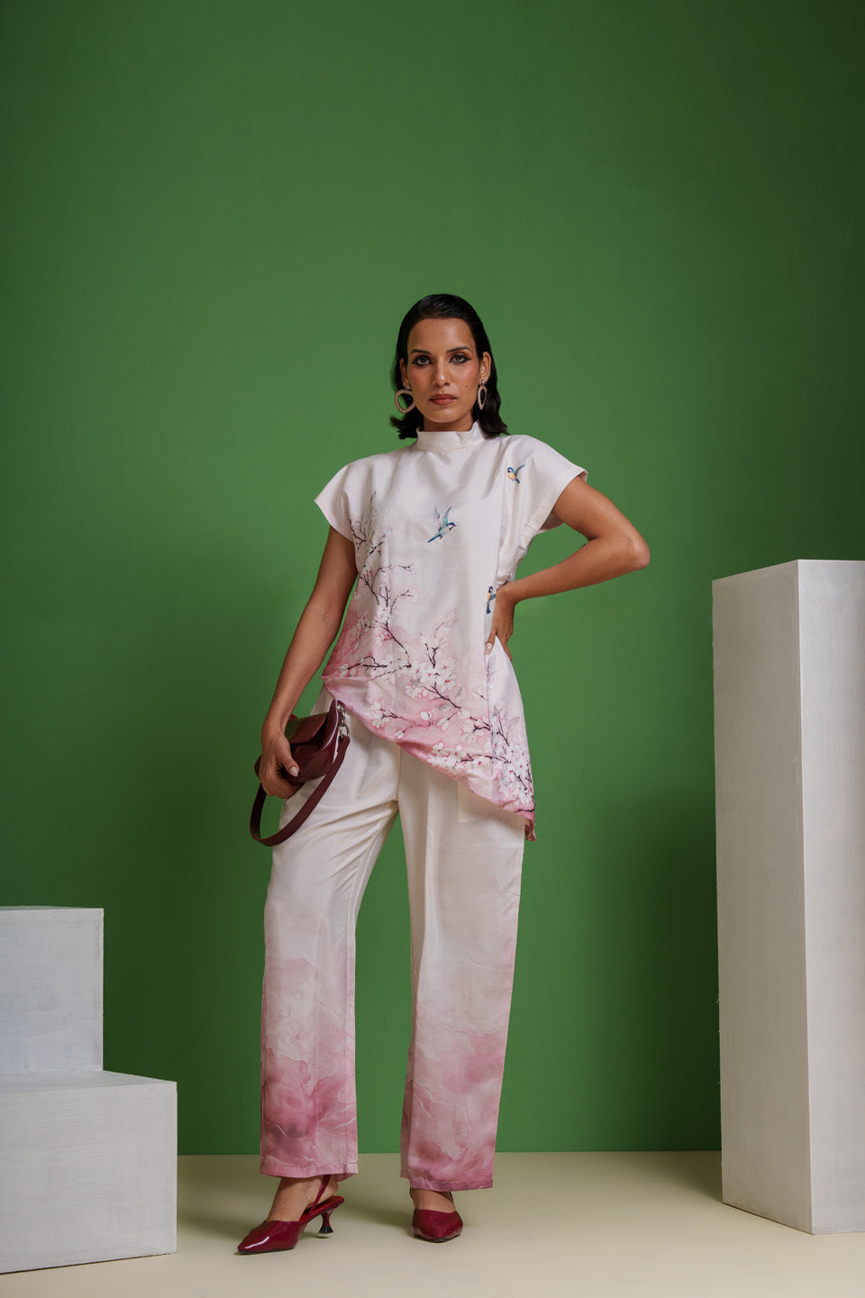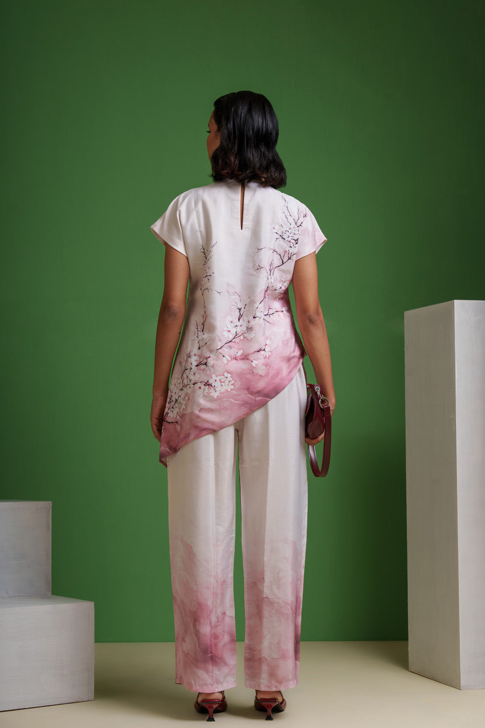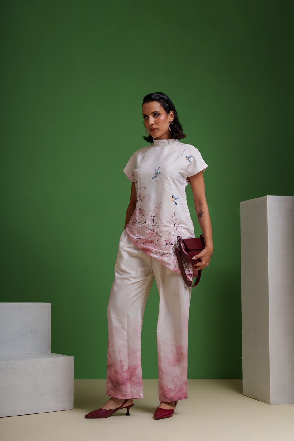 - Blossoms branch out across the chest and hemline of the top, while trousers have a subtle pink fade at the bottom — ensuring a balanced, graceful finish.