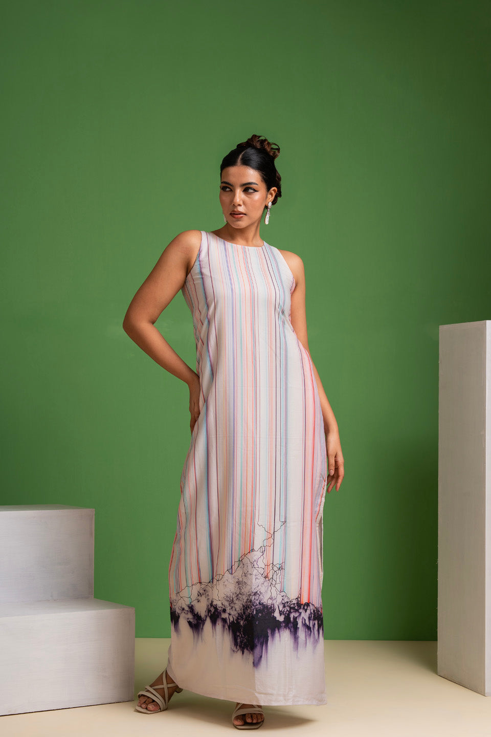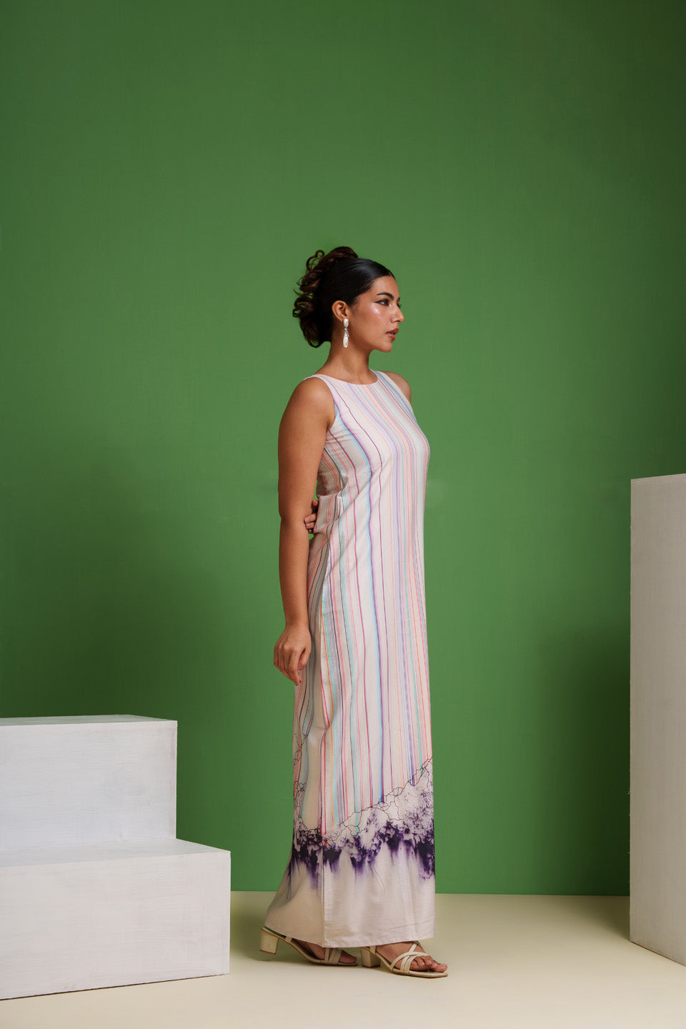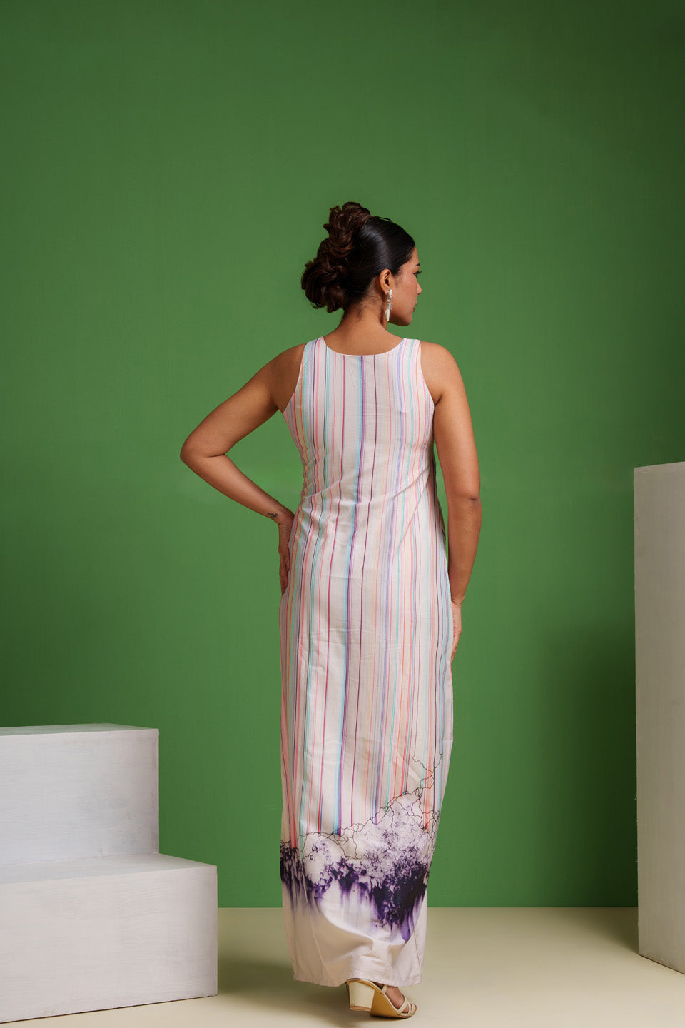 - Aesthetic - Minimal yet artsy – pastel vertical stripes create a soft elongating effect, while the bold abstract splash at the hem adds a modern, edgy contrast.