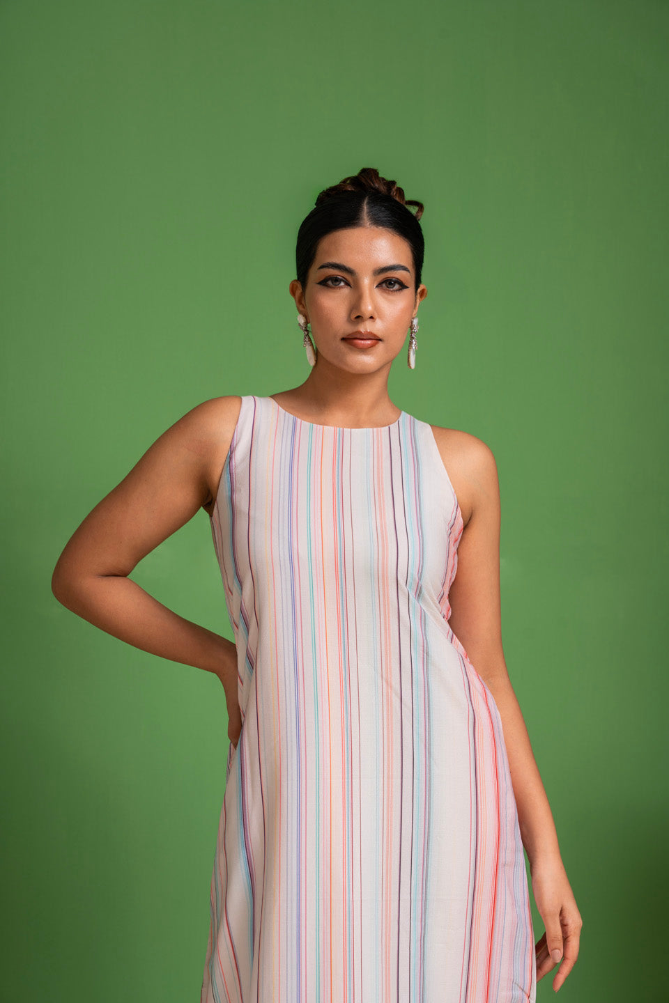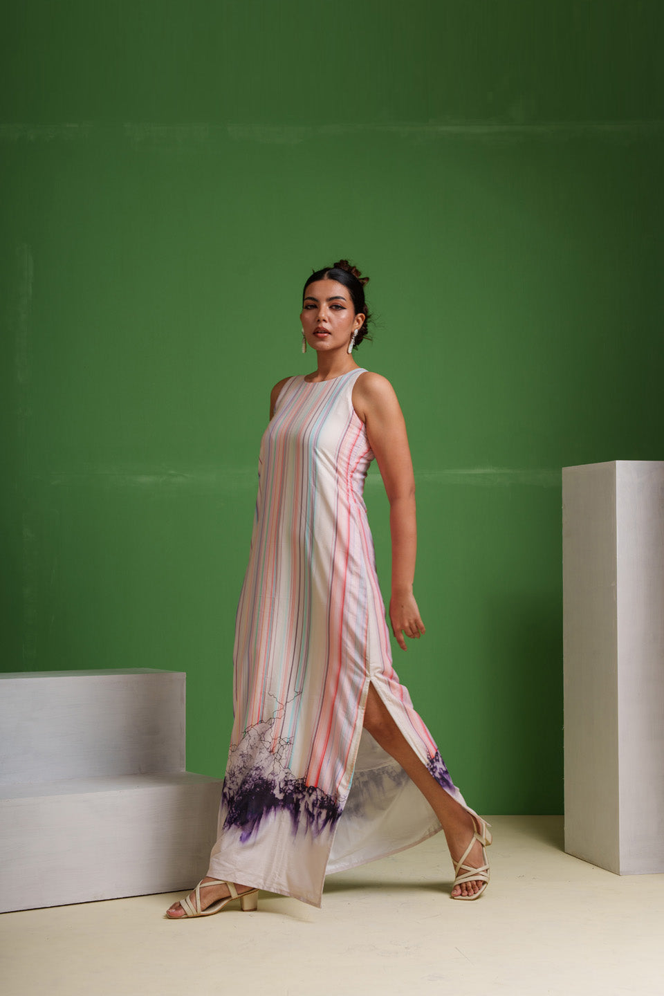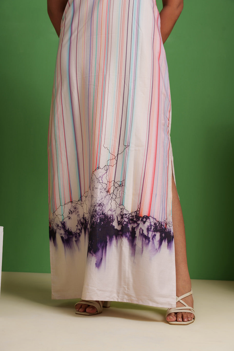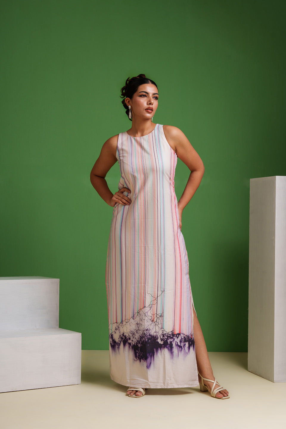 - Aesthetic - Minimal yet artsy – pastel vertical stripes create a soft elongating effect, while the bold abstract splash at the hem adds a modern, edgy contrast.