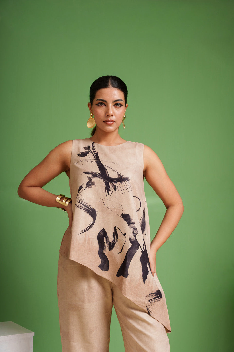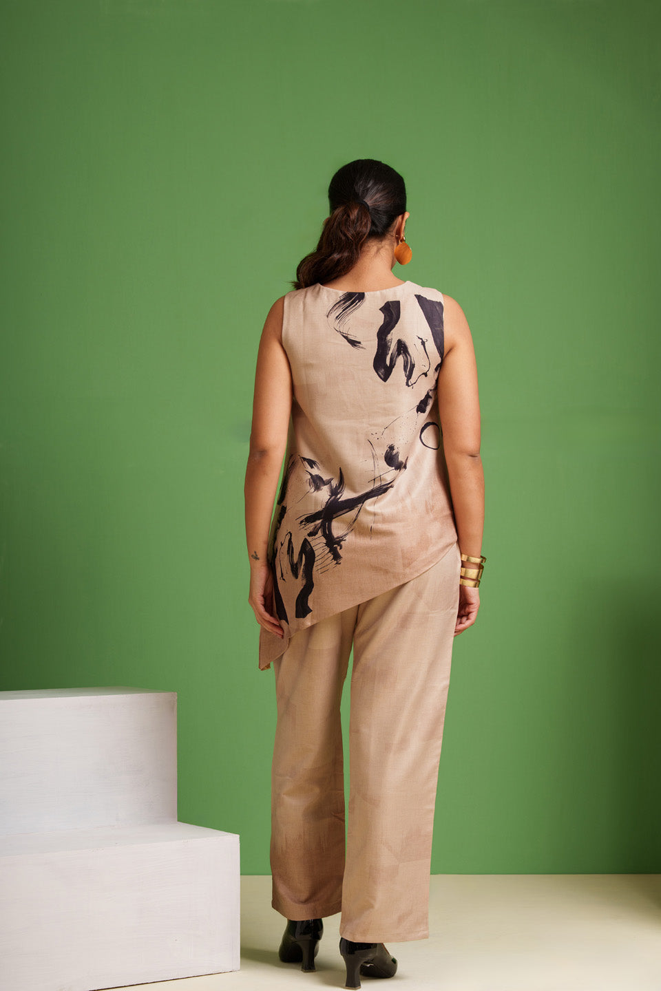 - The trousers are kept plain in taupe-beige, allowing the bold strokes on the top to stand out as the focal element.