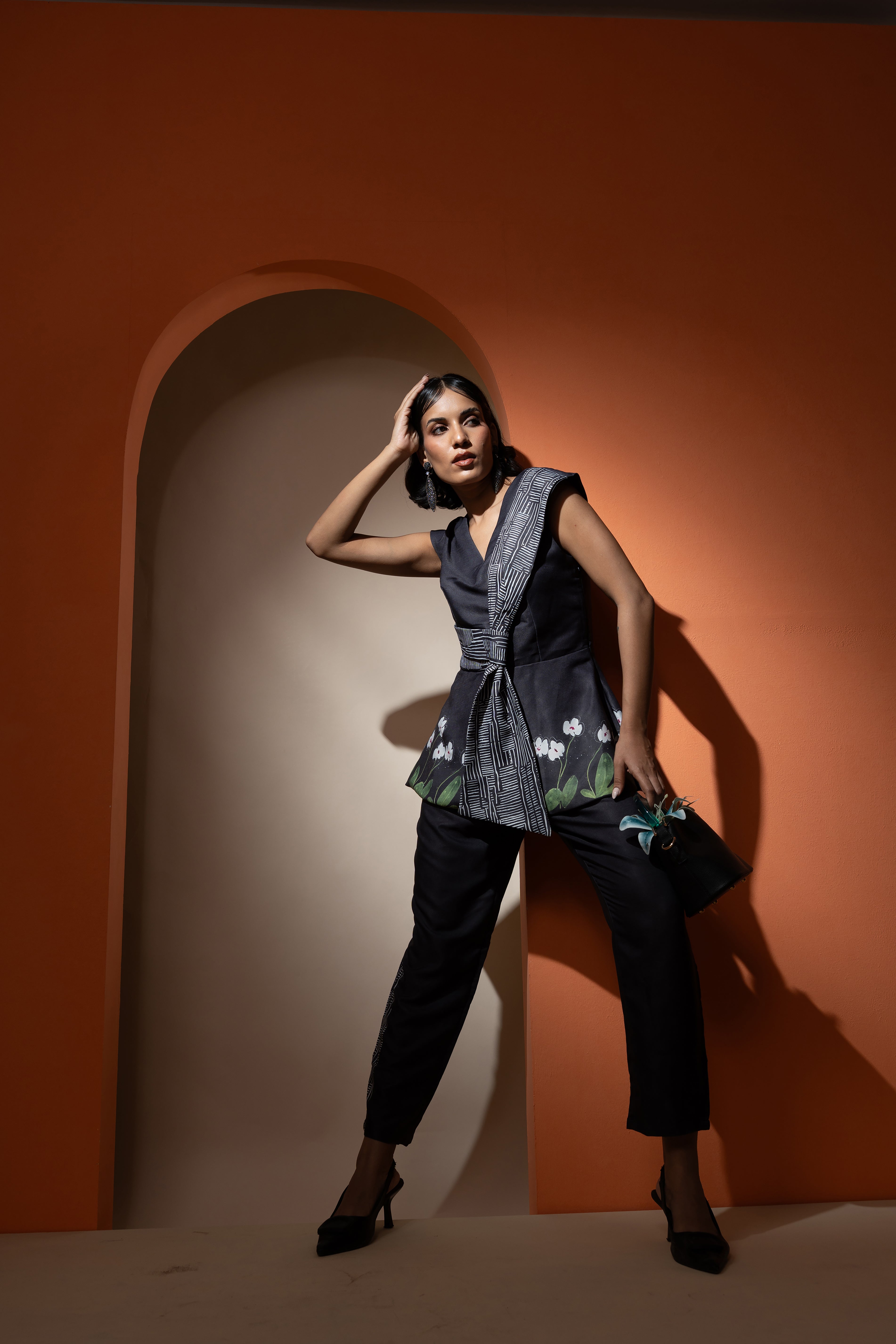 The structured peplum top features a sharp V-neck, cinched waist, and an asymmetric geometric drape, while white floral motifs at the hem add a soft artistic edge. Paired with slim, tailored trousers featuring a matching geometric side panel for a cohesive, fashion-forward look. Crafted in Soft Rolex Slub fabric for a polished finish — perfect for cocktail nights, art events & chic festive evenings. “Geometry of power. Poetry of florals.”