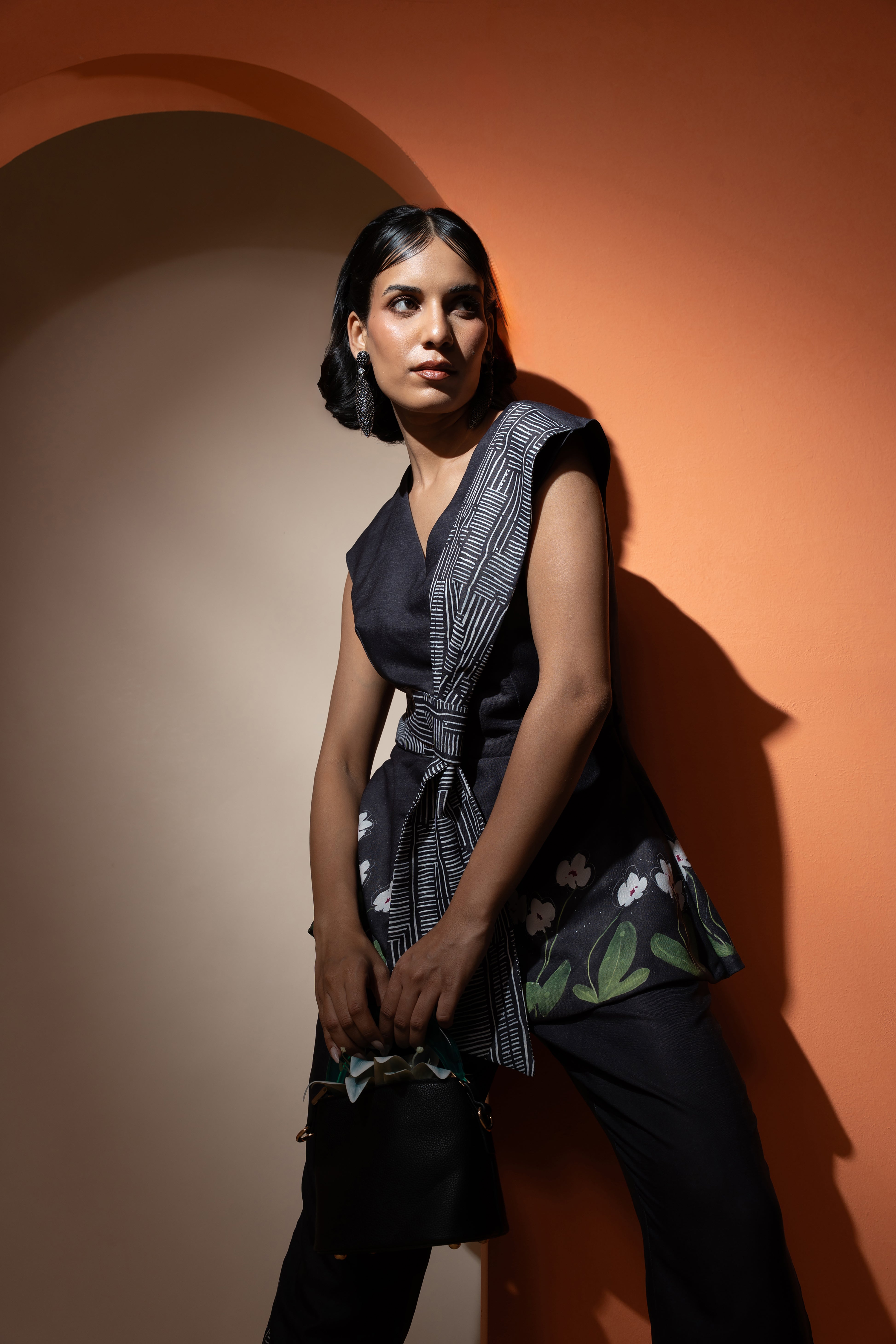 A charcoal-black coord set that blends modern geometry with botanical elegance.