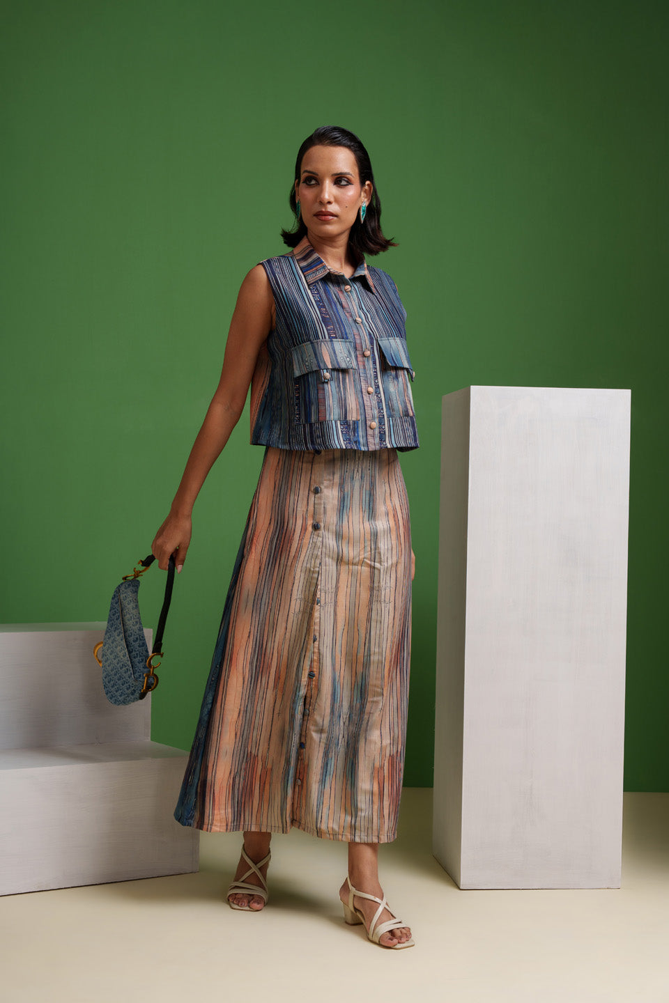 - In the Skirt Sandy beige base with streaks of peach, terracotta, soft navy, and muted aqua.