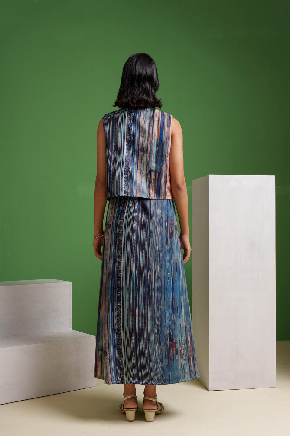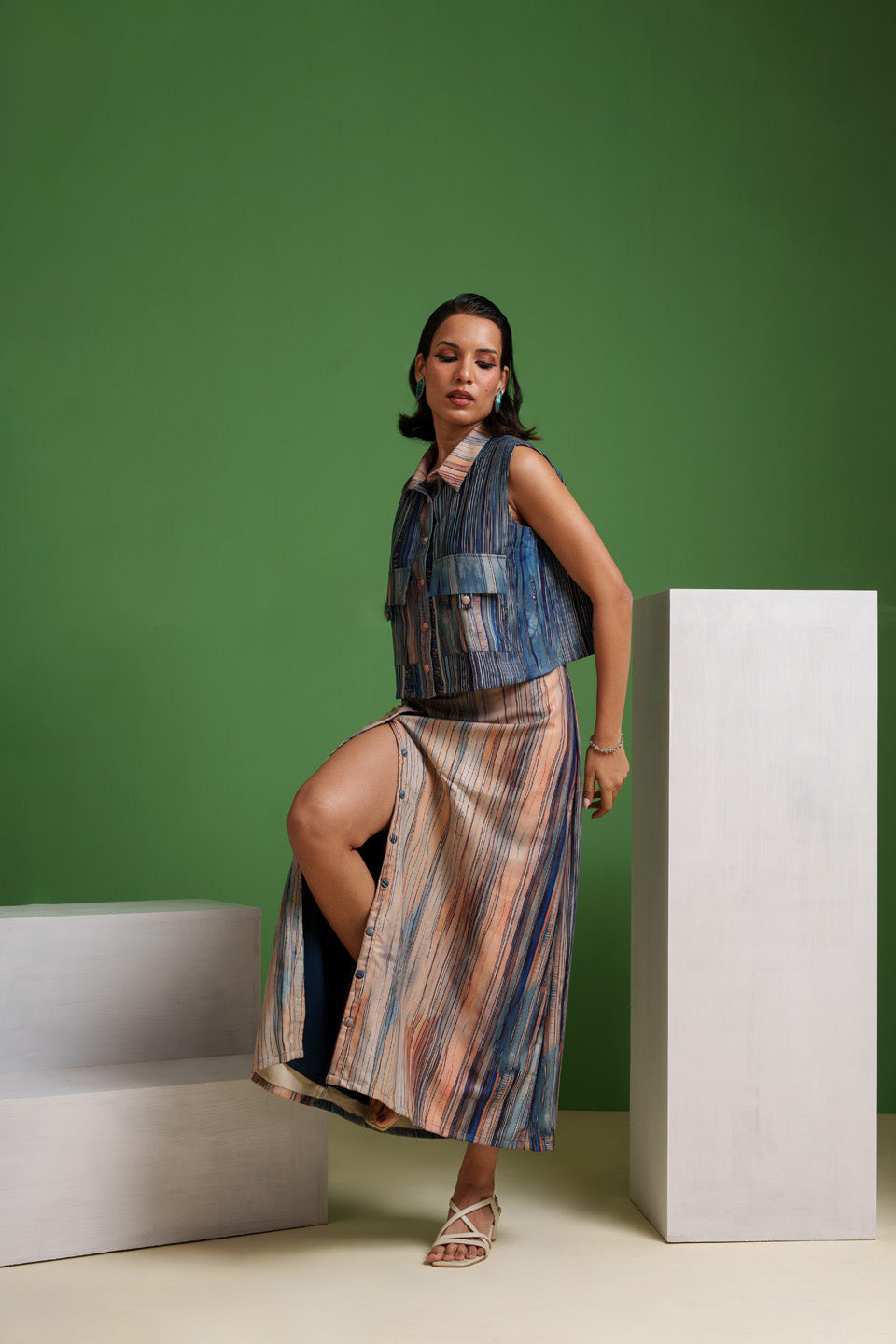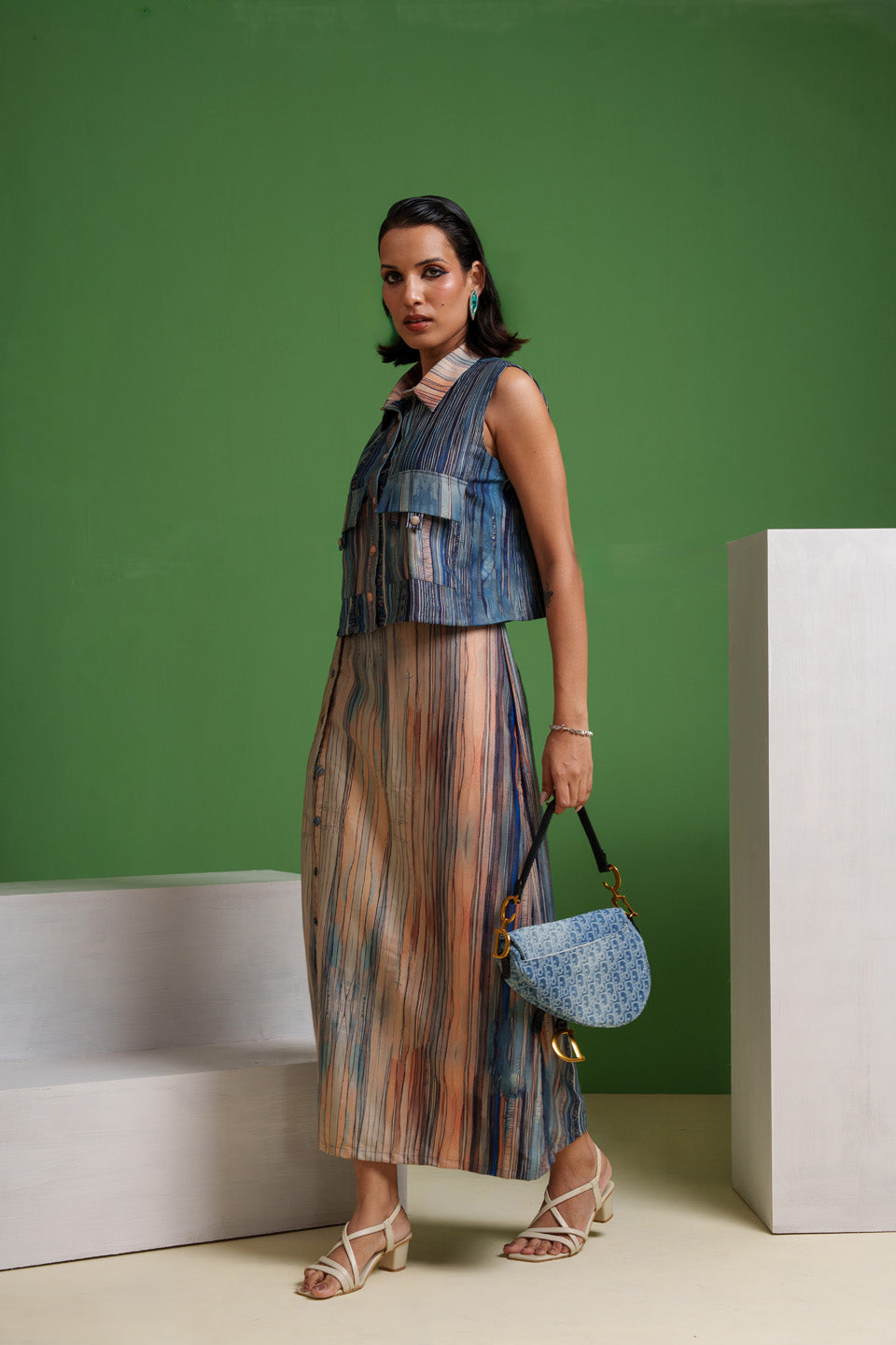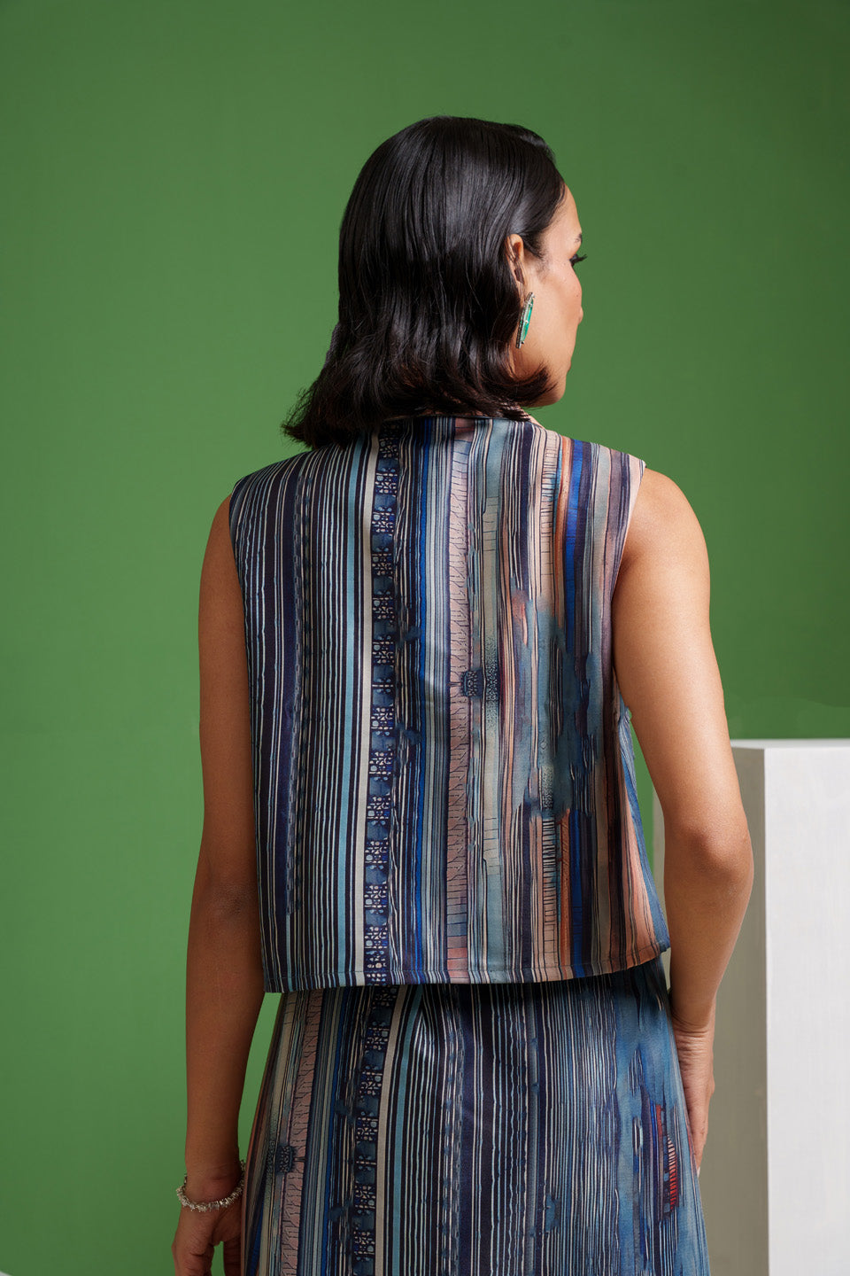 - Fabric/Print- Vertical linear stripe print in deep navy, muted teal, and earthy beige hues, creating a textured, painterly effect.