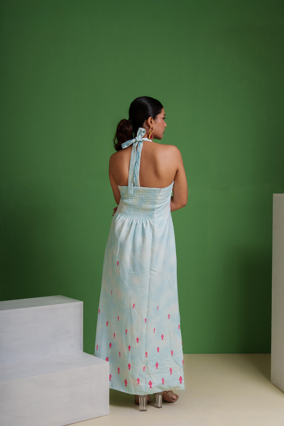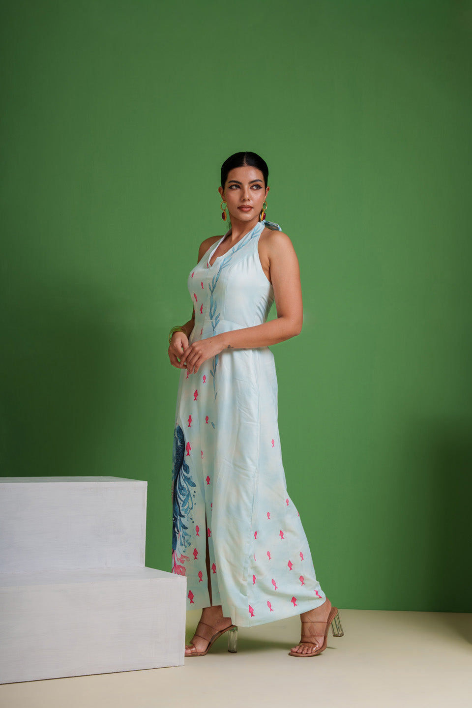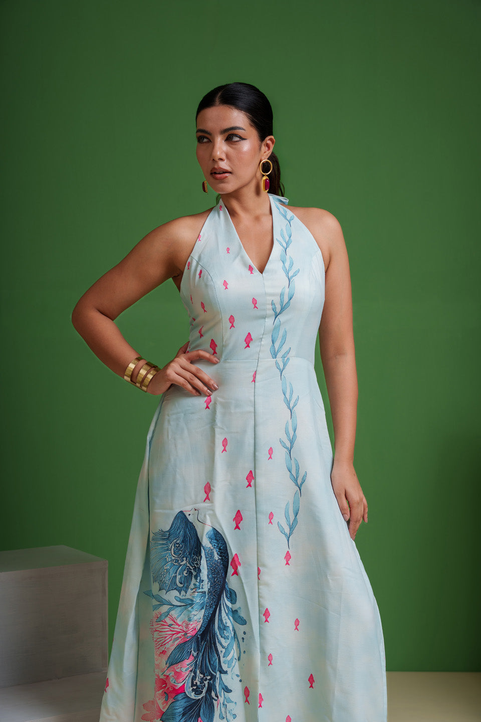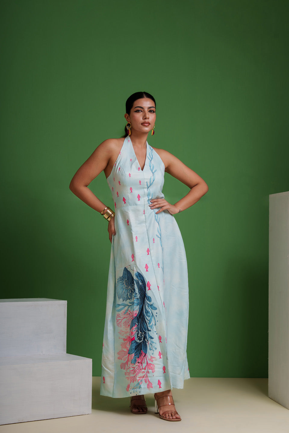 - Silhouette - Floor length halter neck gown with a flowy A-line cut.