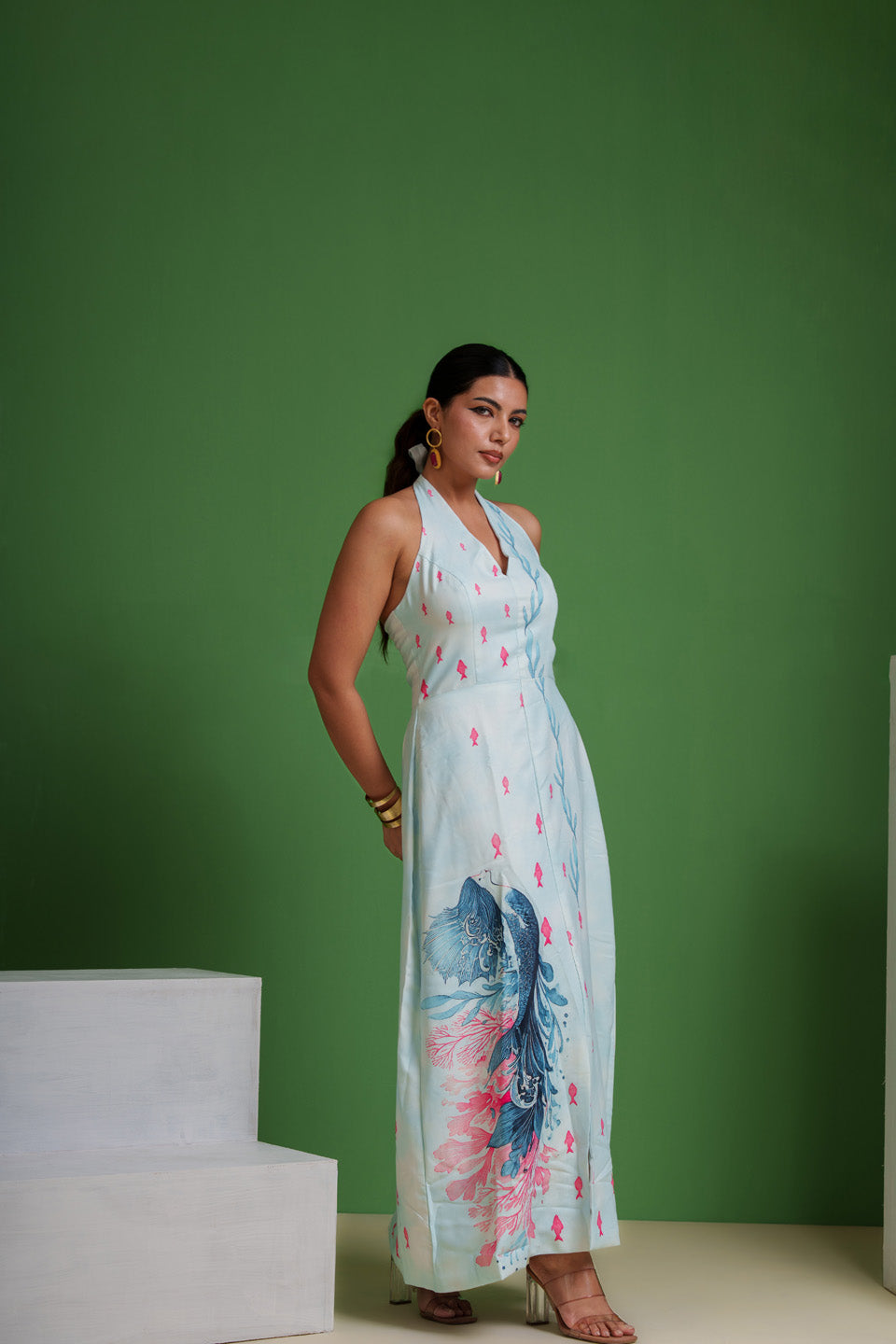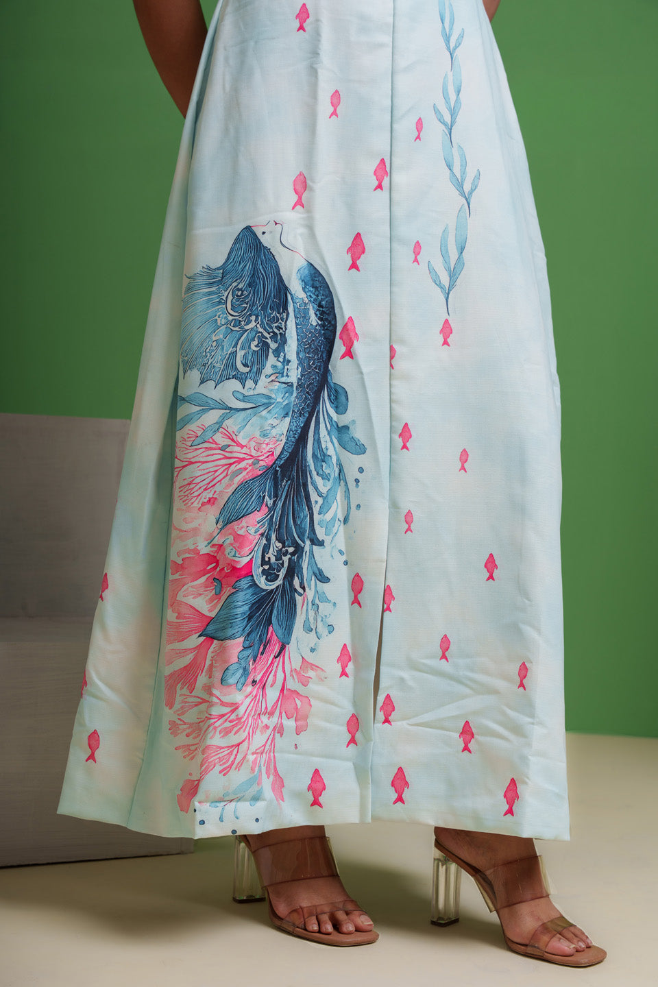 - Small scattered pink fish motifs throughout the bodice for a playful oceanic vibe.