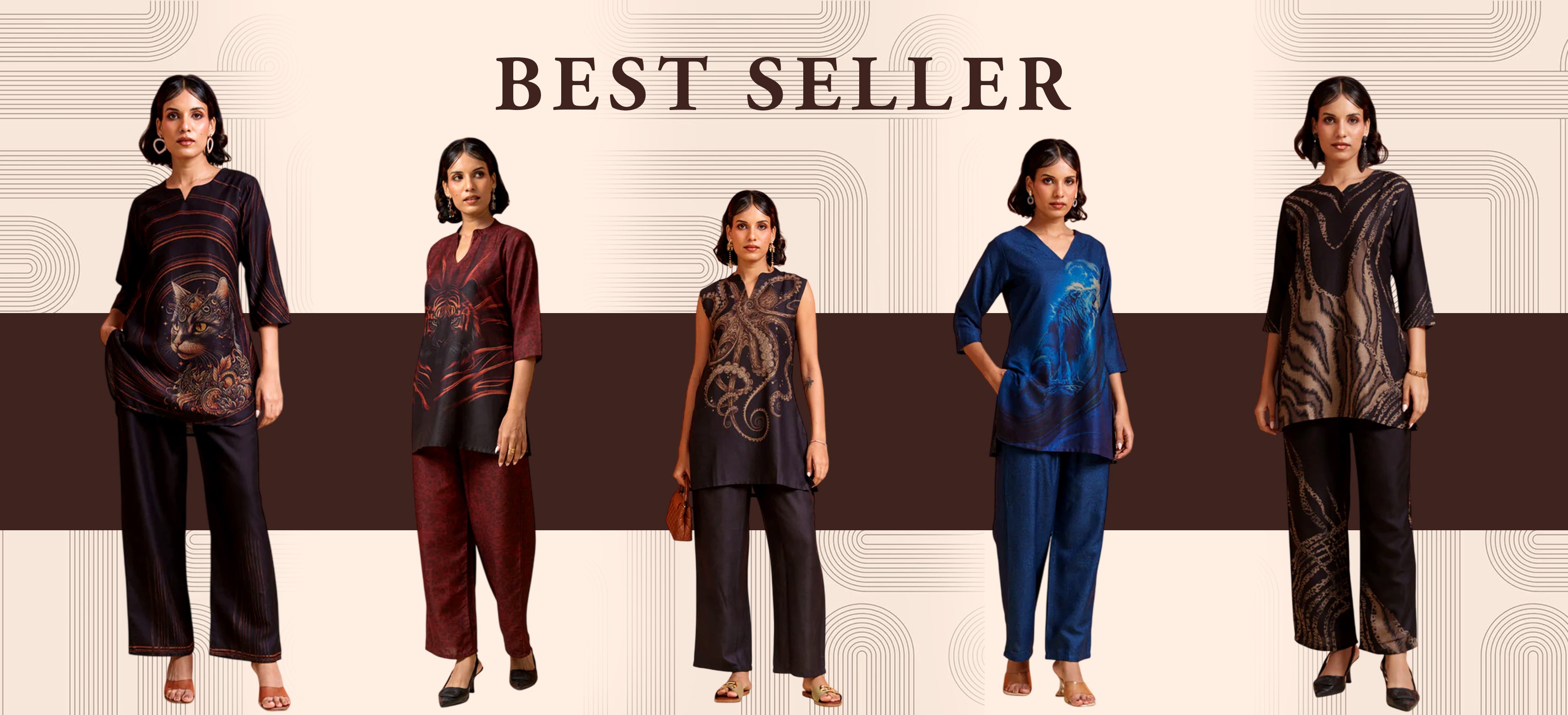 A flowy saree on ivory with grey and rust tiger motifs and a bold pallu tiger face. Abstract wave strokes add an artistic edge. Paired with an ivory blouse, it blends wildlife realism with modern couture—perfect for cocktail evenings and art events. “Roar of Elegance.”
